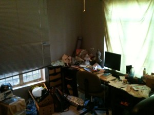 If only there were some sort of magic wand that I could wave and this mess would just be organized. So, as ashamed of my dirty little secret as I am, I think acknowledging it is the first step to recovery. This picture is my area of the office that I share with my honey. His desk: generally clean… a few bits of paper, a pen or two, a stack of CDs and a few receipts from whatever, are the only things on it besides his computer. As you can see from the image here, mine is exactly the opposite. There’s nothing that will fit, that isn’t on this desk. There’s all the stuff from the trunk of my totaled car that’s been here for months (car was wrecked in November), school books, notebooks, papers, bags that I can’t manage to toss, cups and more cups, likely a plate or two (since I eat at my desk more times than not), clothes… you name it. I’ve got it in my little corner. It’s truly a sad state of affairs and I hate it.